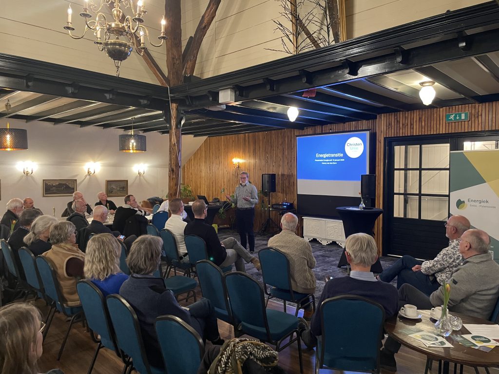 Zoals gebruikelijk werd bij het Energiecafé ook iemand uit de lokale politiek uitgenodigd. Deze avond was dat Hennie van de Born (ChristenUnie). In zijn presentatie benadrukte hij dat het niet alleen gaat om nieuwe technieken, maar vooral om verantwoord en verminderd gebruik van energie en grondstoffen. Daarbij gaf hij aan dat verduurzaming altijd in samenhang bekeken moet worden, met oog voor mens, omgeving en toekomstige generaties.